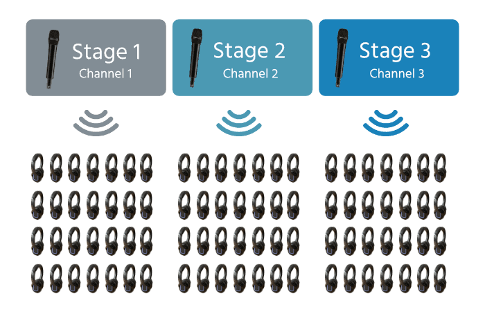 I modsætning til det traditionelle møde eller konference betyder dette, at man ikke er afhængig af højttaleranlæg til formidling af lyd. Lyden sendes direkte til deltagernes hovedtelefoner, hvilket har flere fordele. For mødedeltagerne er en af fordelene at de nemt kan fokusere udelukkende på det præsenterede og ikke generes af baggrundsstøj m.m. En anden stor fordel er at hver hovedtelefon har kanalvælger (til lyd). Derfor kan mødedeltagerne nemt bevæge sig rundt på et venue og lytte til netop den kanal (taler) de ønsker at lytte til. For dig som arrangør har det den fordel, at du kan udnytte dit venue-space bedre. Det kan du fordi der ikke benyttes højttaleranlæg til talerne og lyden sendes direkte til deltagernes hovedtelefoner. Herved kan flere scener placeres tættere i rummet/salen og benyttes samtidig, da de forskellige scener ikke behøver at være skærmet lydmæssigt af fra hinanden.